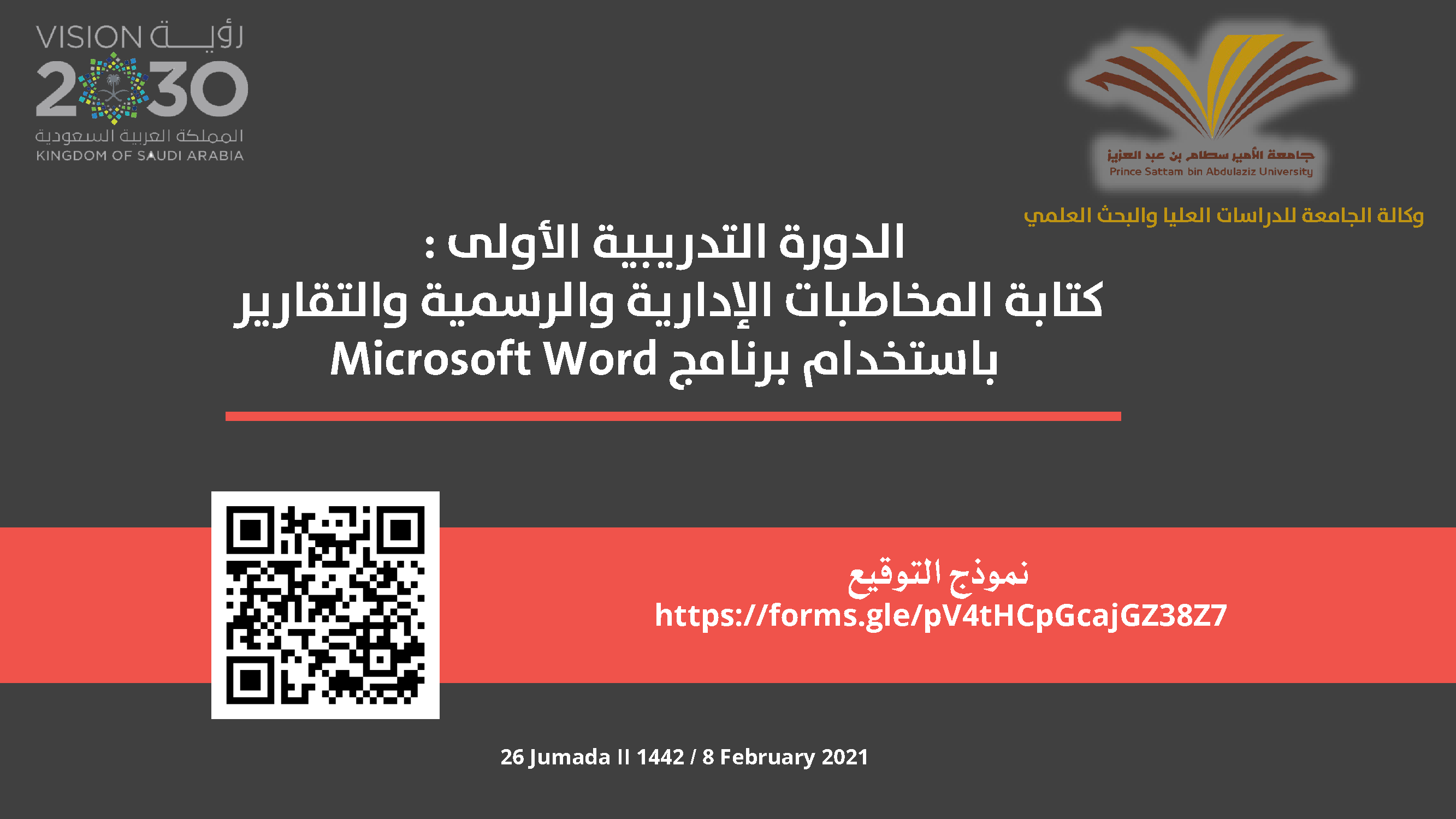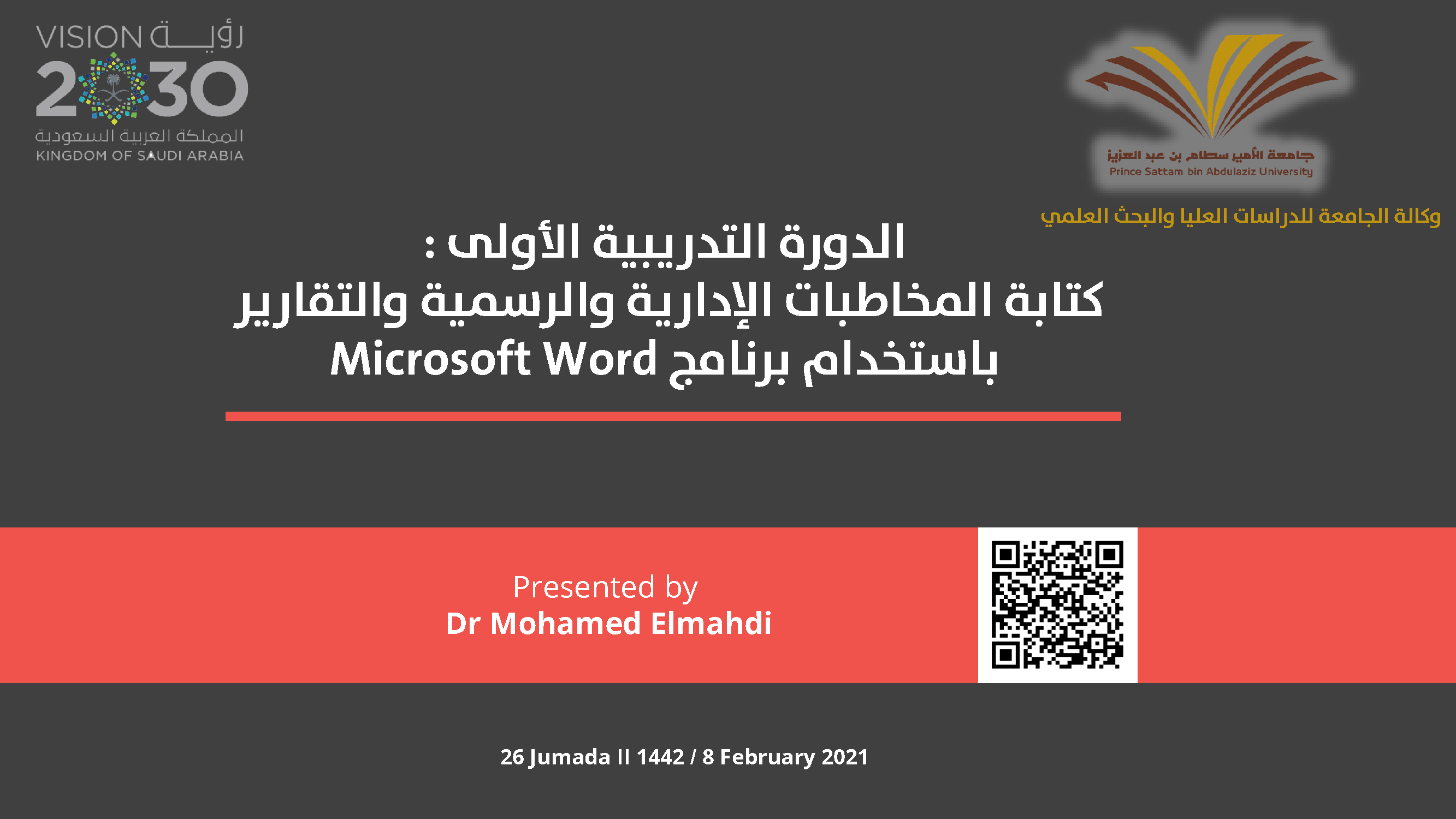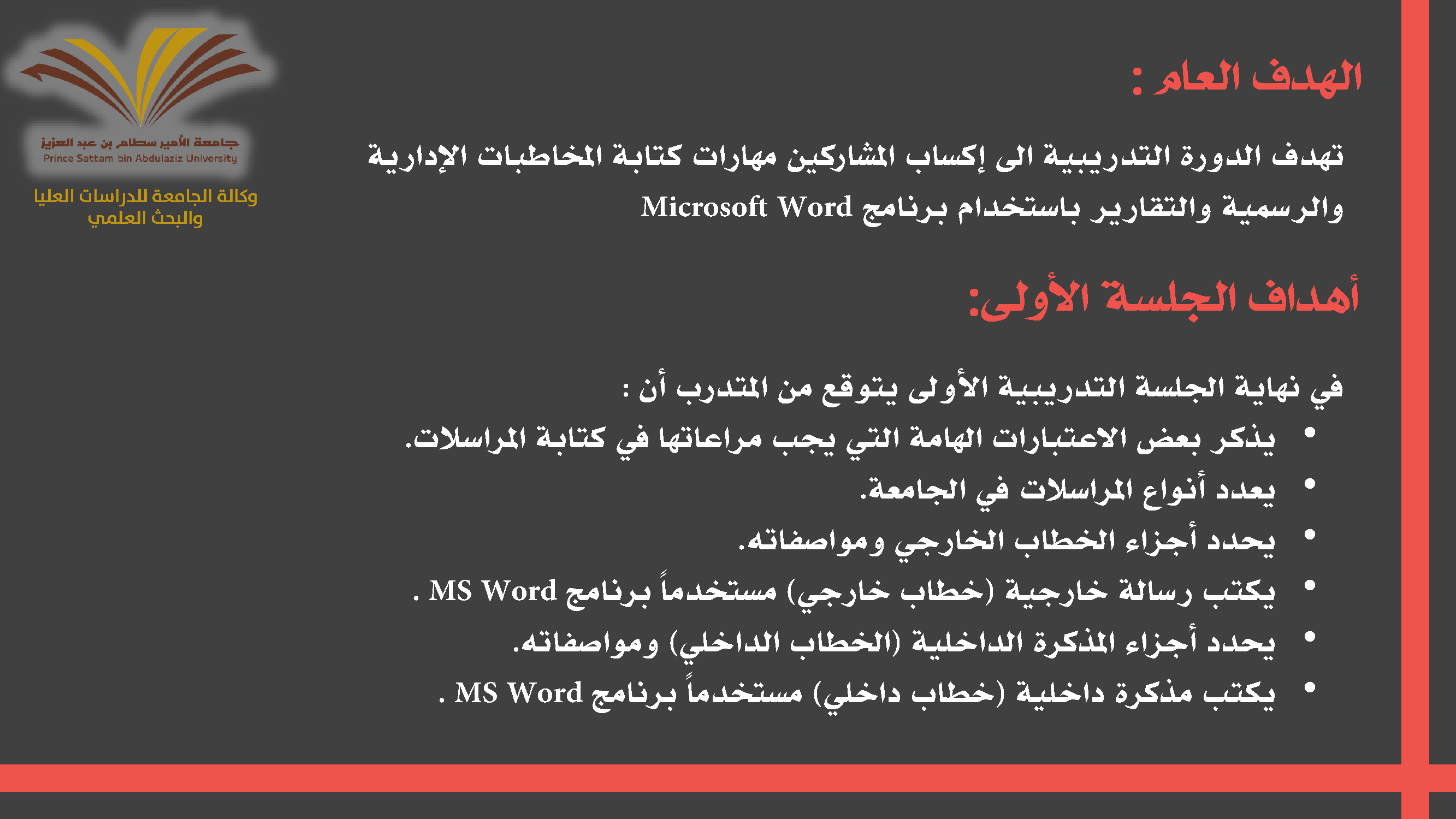 ضمن خطة وكالة الجامعة للدراسات العليا والبحث العلمي لتطوير قدرات منسوبيها ومنسوبي العمادات والجهات التابعة نفذت الوكالة الدورة التدريبية الأولى بعنوان " كتابة المخاطبات الإدارية والرسمية والتقارير باستخدام برنامج Microsoft Word”، وذلك ضمن سلسلة من الدورات التدريبية تبدأ من الأسبوع الرابع الى الأسبوع العاشر من الفصل الدراسي الحالي ، وقدم الدورة التدريبية سعادة د. محمد المهدي عبد الرحمن المستشار بالوكالة ، وقد تناولت الدورة التدريبية خلال الجلسة الأولى فى يوم الثلاثاء بتاريخ 1442/6/27هـ الموافق 2021/2/9م المحاور التالية : الاعتبارات الهامة التي يجب مراعاتها في كتابة المراسلات. أنواع المراسلات في الجامعة. أجزاء الخطاب الخارجي ومواصفاته. كتابة رسالة خارجية (خطاب خارجي) نموذجية باستخدام برنامج MS Word . أجزاء المذكرة الداخلية (الخطاب الداخلي) ومواصفاته. كتابة مذكرة داخلية (خطاب داخلي) نموذجية باستخدام برنامج MS Word . كما تناولت خلال الجلسة التدريبية الثانية فى  يوم الأربعاء بتاريخ 1442/6/28هـ الموافق 2021/2/10م المحاور التالية : أجزاء خطاب الإحالة الداخلية ومواصفاته. كتابة خطاب إحالة داخلية نموذجي باستخدام برنامج MS Word . أجزاء خطاب التعميم ومواصفاته. كتابة خطاب تعميم نموذجي باستخدام برنامج MS Word . أجزاء خطاب القرار ومواصفاته. كتابة خطاب قرار نموذجي باستخدام برنامج MS Word . أجزاء التقرير ومواصفاته.