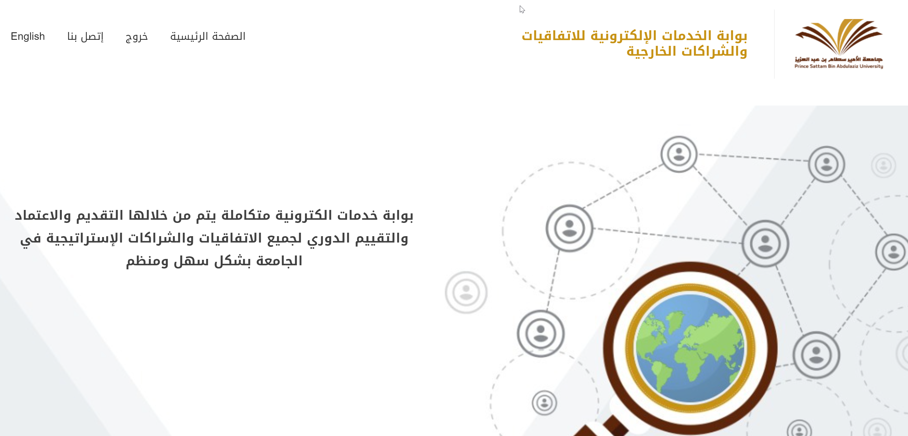 دشن وكيل الجامعة للدراسات العليا والبحث العلمي رئيس اللجنة الدائمة للتعاون الدولي والشراكة المعرفية والمجتمعية سعادة الأستاذ الدكتور عبدالرحمن بن إبراهيم الخضيري بوابة الخدمات الإلكترونية للاتفاقيات والشراكات الخارجية والتي تم تطوريها بتعاون مشترك بين إدارة الاتفاقيات والشراكات الخارجية وعمادة تقنية المعلومات والتعليم عن بعد بهدف تطوير بيئة إلكترونية موحدة يقدم من خلالها جميع الخدمات من تقديم طلبات واعتماد وتقييم أداء لاتفاقيات وشراكات الجامعة وبشكل سهل ومنظم مما يسهم في دعم منظومة العمل المؤسسي وكذلك دعم جوانب التطور في التعاملات والخدمات الإلكترونية في الجامعة.